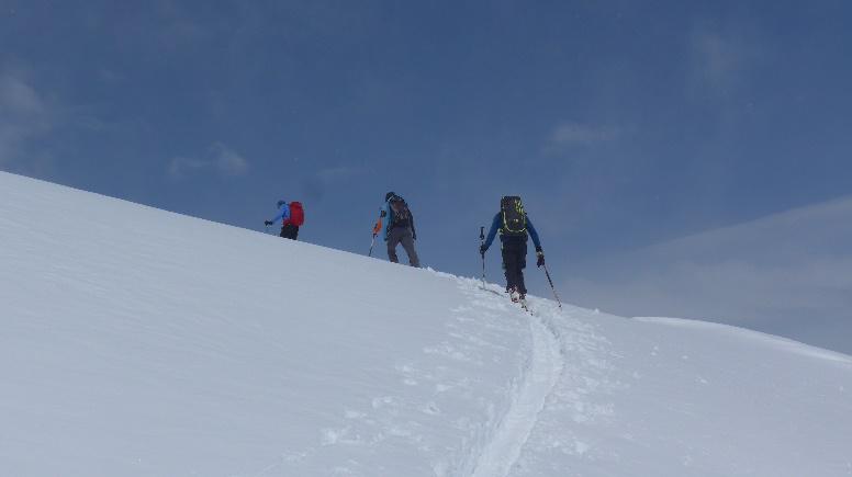 Weiter hinten im Tal, als die Hänge steiler wurden, lichtete sich die Wolkendecke. Wir konnten immer wieder das Gelände sehen und so weiter bis über die Wolkendecke aufsteigen. Dort wurden wir mit schönstem Sonnenschein belohnt, wobei uns zeitlich die unerwartet hohen Temperaturen im Aufstieg schon zu schaffen machten. Wegen des Wetters und der anschließenden Abfahrt war es eine der schönsten Skitouren die wir dort unternommen haben.
